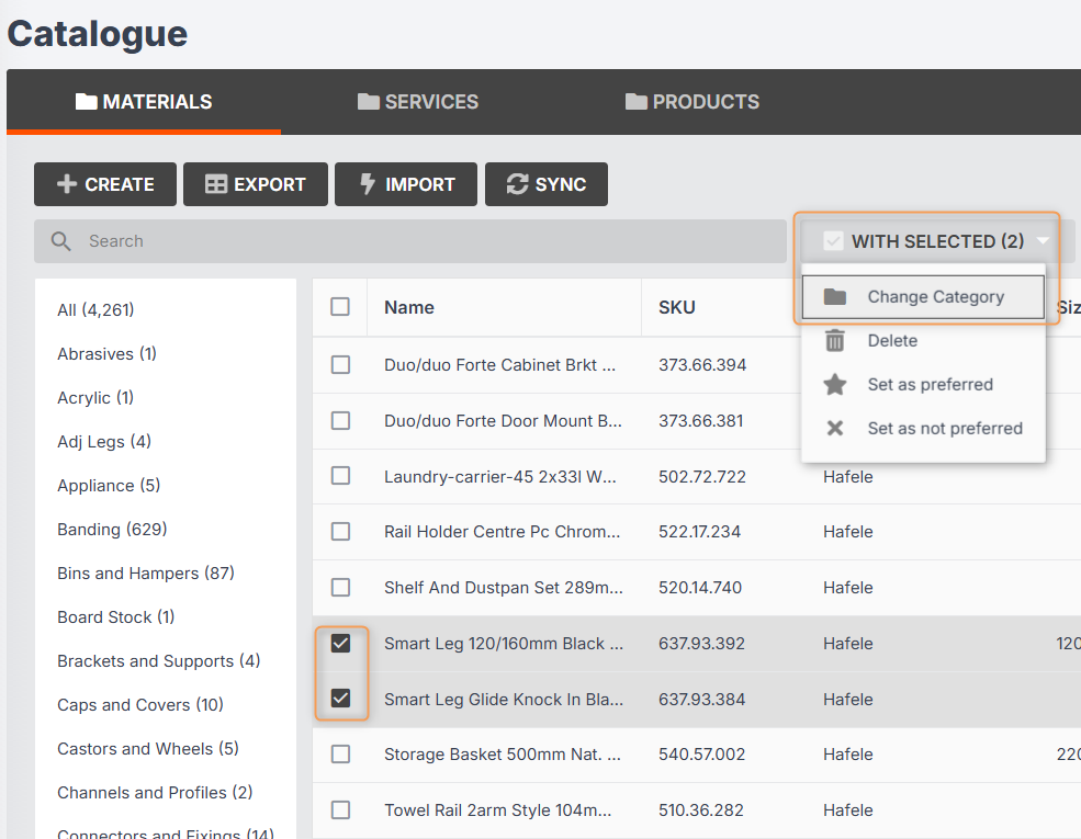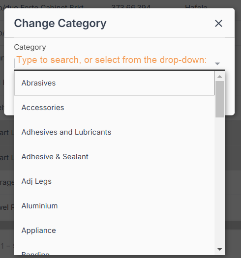You can change which category a material or service in your catalogue belongs to. This is useful if you have mass-imported a number of items and they have defaulted to an “Import” category.