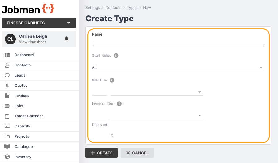 Use contact types to quickly and easily categorise your contacts for future reference. Set the parameters for contact types by adding payment terms and staff access levels.