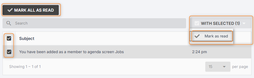 You can use the Mark All As Read button to mark all unread notifications as “read”. Or, you can use the tick boxes to select one or more notifications, and then click With Selected > Mark As Read: