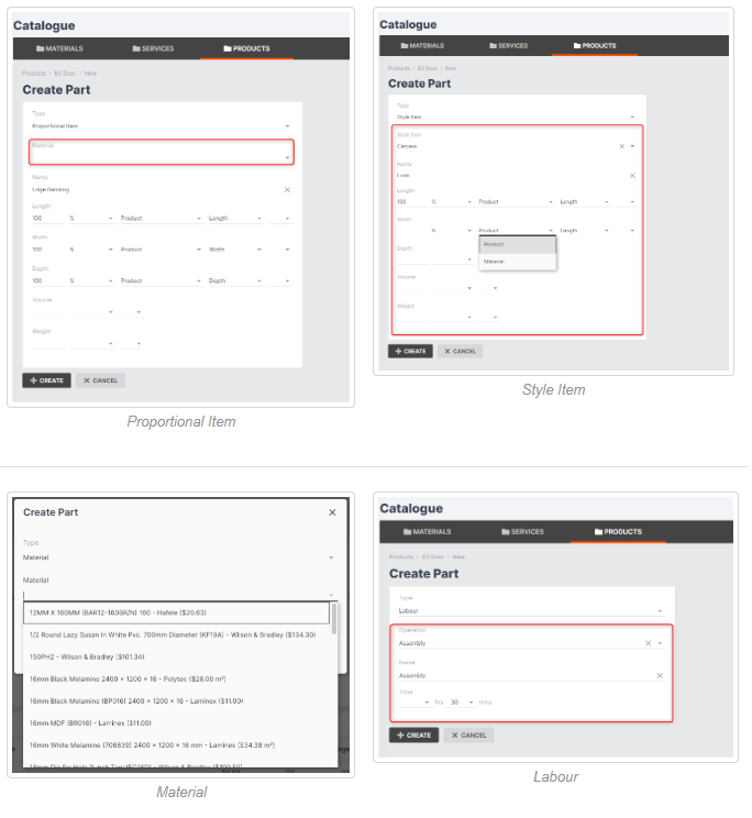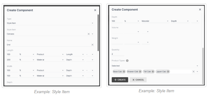 - Style Item: Use for parts that have more than one range option. For example, the product might be a drawer, and the style item might be “handles”. You might use cheaper or more expensive handles across different quotes. Setting the handle as a style item allows you to easily select the option you want for each quote.