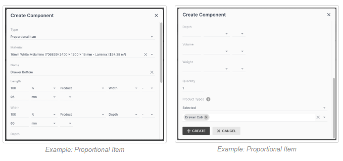 - Proportional Item: Add a required material and then apply a parametric measurement for selected properties for this item (e.g. length, width, depth, volume, or weight).The pricing of the proportional item will then change according to the material price multiplied by the part size when you add your product to a quote.