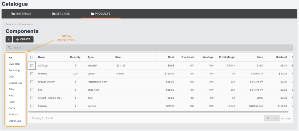 - From the User Menu Panel, navigate to Catalogue > Products > Components: