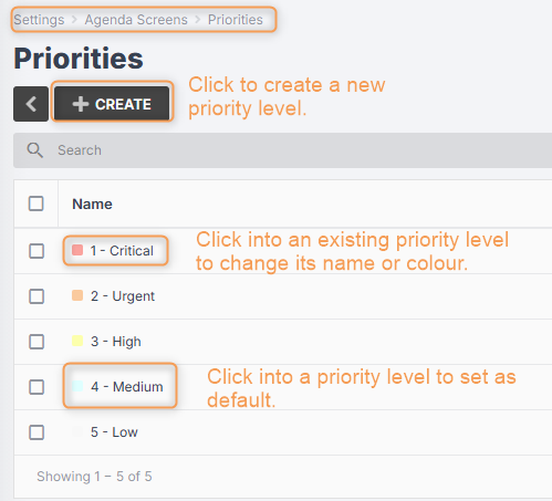 To update an existing priority, click into it and you can change the name or colour, or Set as Default.