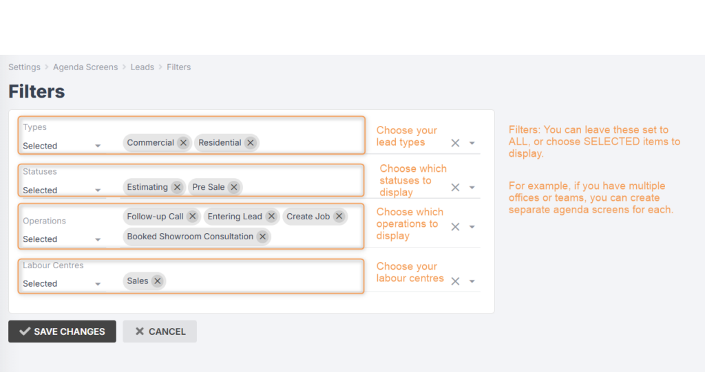 An agenda screen is a to-do list for one or more staff in your organisation. Each agenda screen is typically created for a specific department, area, or team within the organisation, and contains a list of all job, lead, or project tasks needing to be completed by that team, in priority order.