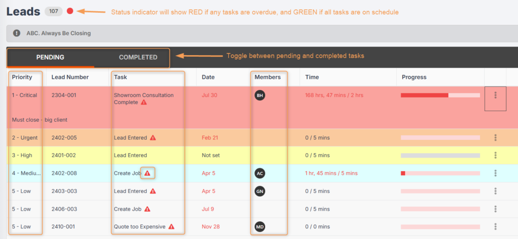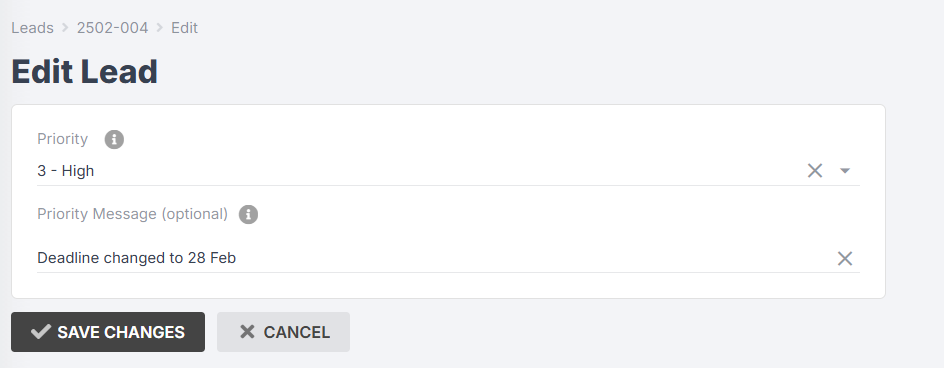 - If a lead needs to be prioritised, you can change the due dates or update the lead’s priority, and staff will see this on the agenda screen.