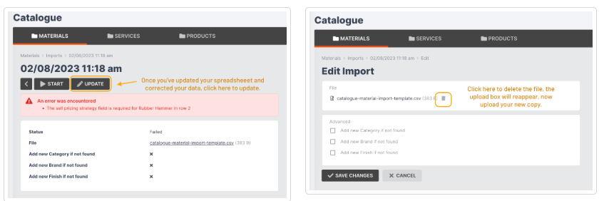 Delete entries not in this file – If you are exporting and reimporting your CSV file, you can click this checkbox, and upon re-import, the materials NOT listed in your CSV will be deleted from your catalogue.