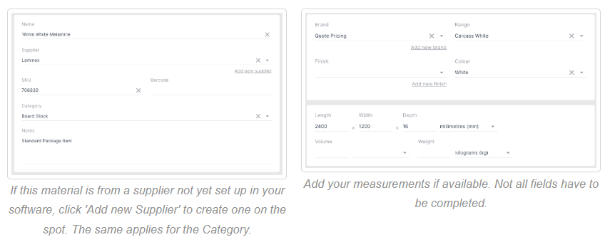You can add materials to your catalogue by importing from a spreadsheet, or by creating them manually one at a time.