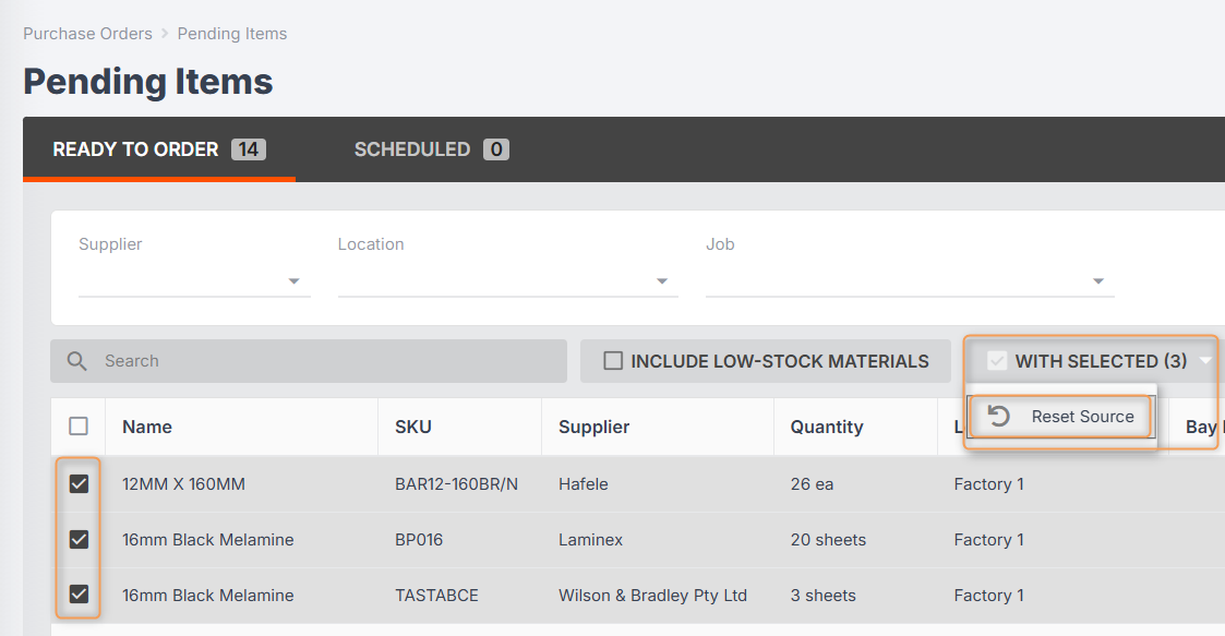 - You can tick Include Low-Stock Materials if you have not selected a job for this PO, and if you want to reorder stock materials that are running low in inventory. (Learn More)