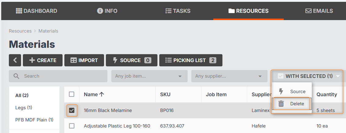 - Set up your jobs, and add materials to them throughout the week (or as needed) – remember to click ‘Source’!