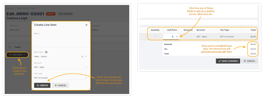 - You will be taken to a blank invoice, where you can add a quote and quote items as above, or manually add individual line items and amounts.