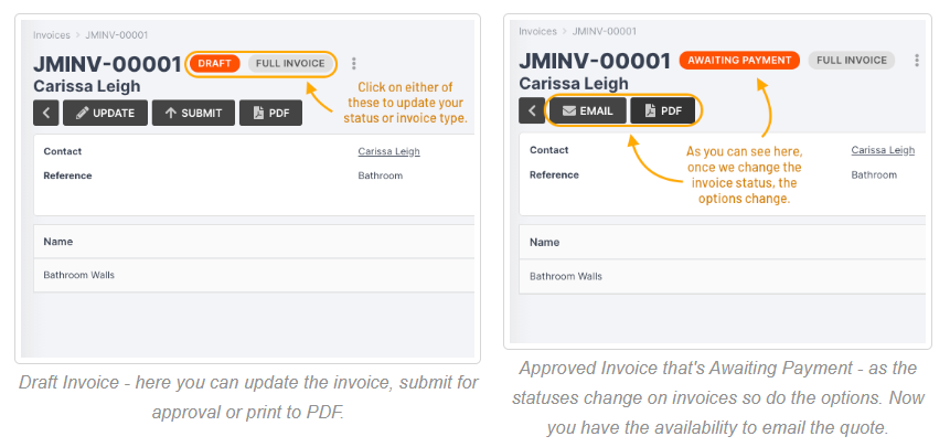 Similarly, invoices created in Jobman will not appear in your accounting software until you submit them. You MUST click “Submit” to sync your invoice. You CANNOT sync your invoice by manually changing the invoice status, e.g. to “Awaiting Payment”.