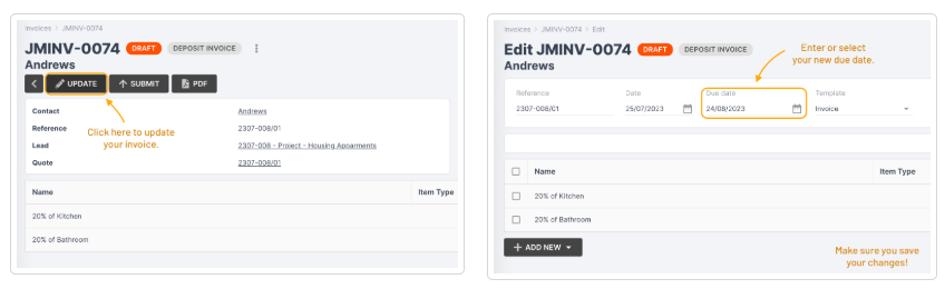 - Click into the invoice or bill you need to edit, either from the Invoices tab or from a Lead, Job, etc.
