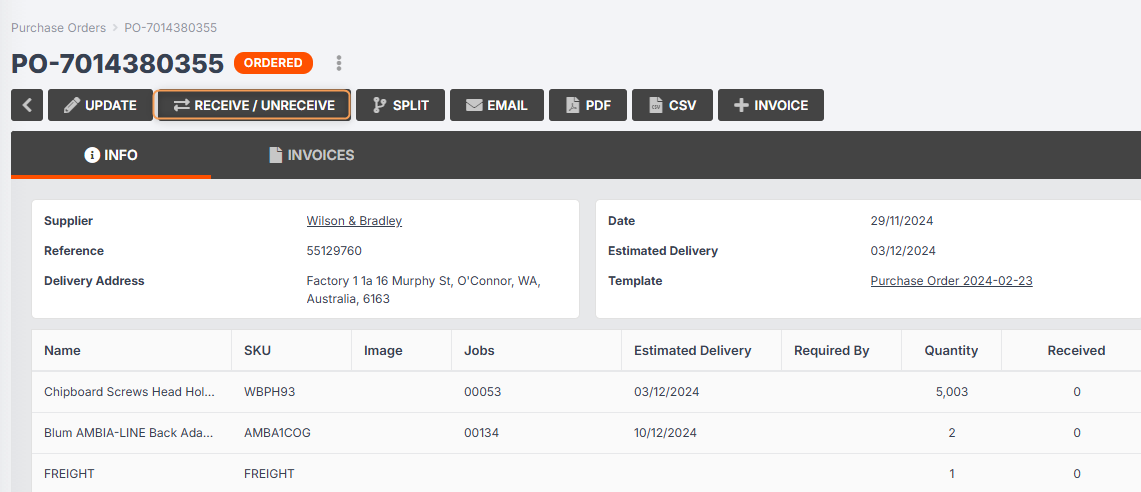 Splitting purchase orders can be useful if certain items are going to be received across different months, or if you have a large purchase order that you want to split across multiple jobs.