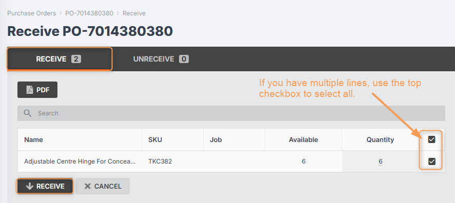 To fully receive the purchase order: Make sure you are in the Receive tab. Check that the quantity of items received matches the quantity of items ordered, then click Receive.