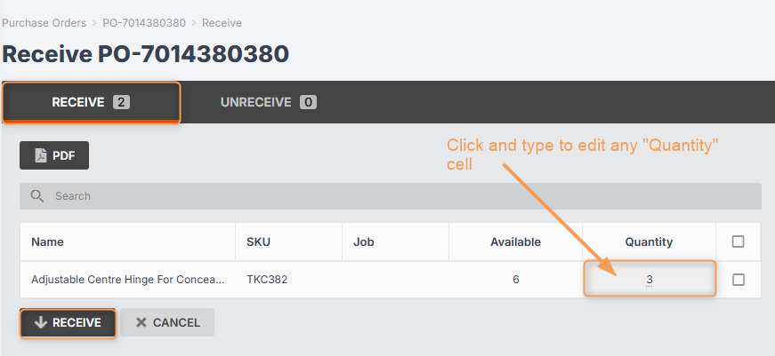 To partially receive the purchase order: Make sure you are in the Receive tab. Click into the Quantity column to edit the quantity of items received, then click Receive.