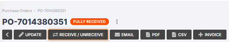 Click Receive / Unreceive. If you cannot see the Receive / Unreceive button, you need to make sure that the purchase order is in a status that can be received.