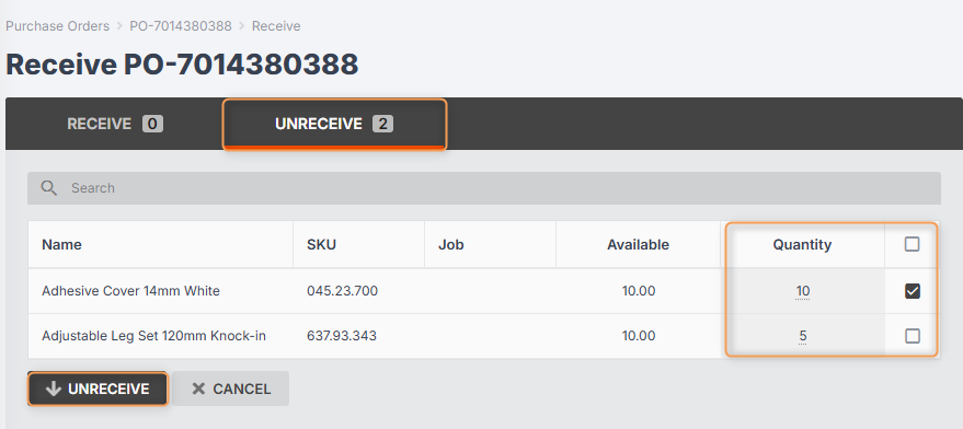 Make sure you are in the Unreceive tab. Use the checkboxes or type in the Quantity cells to enter the materials you want to unreceive, then click Unreceive: