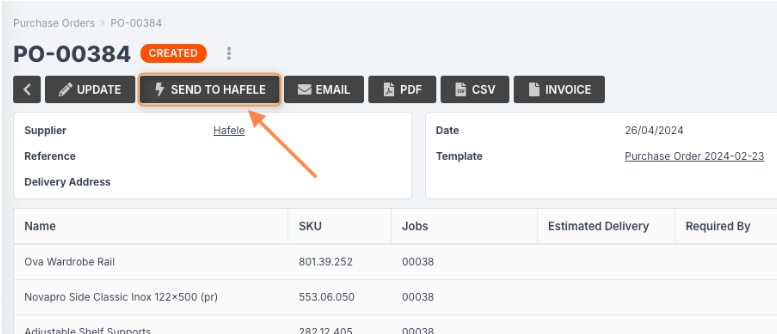 3. Once connected, you should see that your Purchase Order CSVs for the contact that you specified are formatted to suit Hafele. And you should also now be able to send a purchase order directly to them.